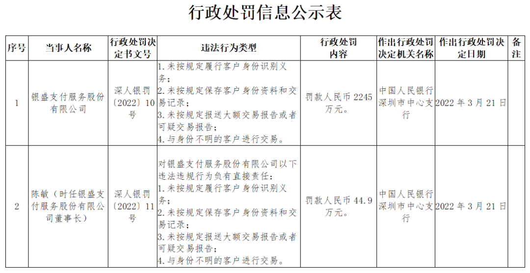 此外,行政處罰決定書(深人銀罰〔2022〕11號(hào))顯示,時(shí)任銀盛支付服務(wù)股份有限公司董事長陳敏對(duì)上述違法違規(guī)行為負(fù)有直接責(zé)任,中國人民銀行深圳市中心支行2022年3月21日對(duì)其罰款人民幣44.9萬元。