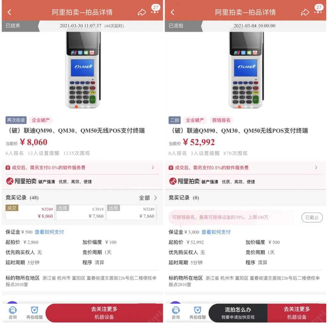 此外,小編還發現其中有部分拍品是剛上架,比如下圖的拉卡拉、卡友支付的2臺終端,起拍價為120元,有多人次圍觀。小編發現該拍品此前拍賣價格是150元,流拍后又降低了30元繼續拍賣的,感覺還得第三次,不然120元買來干嘛?