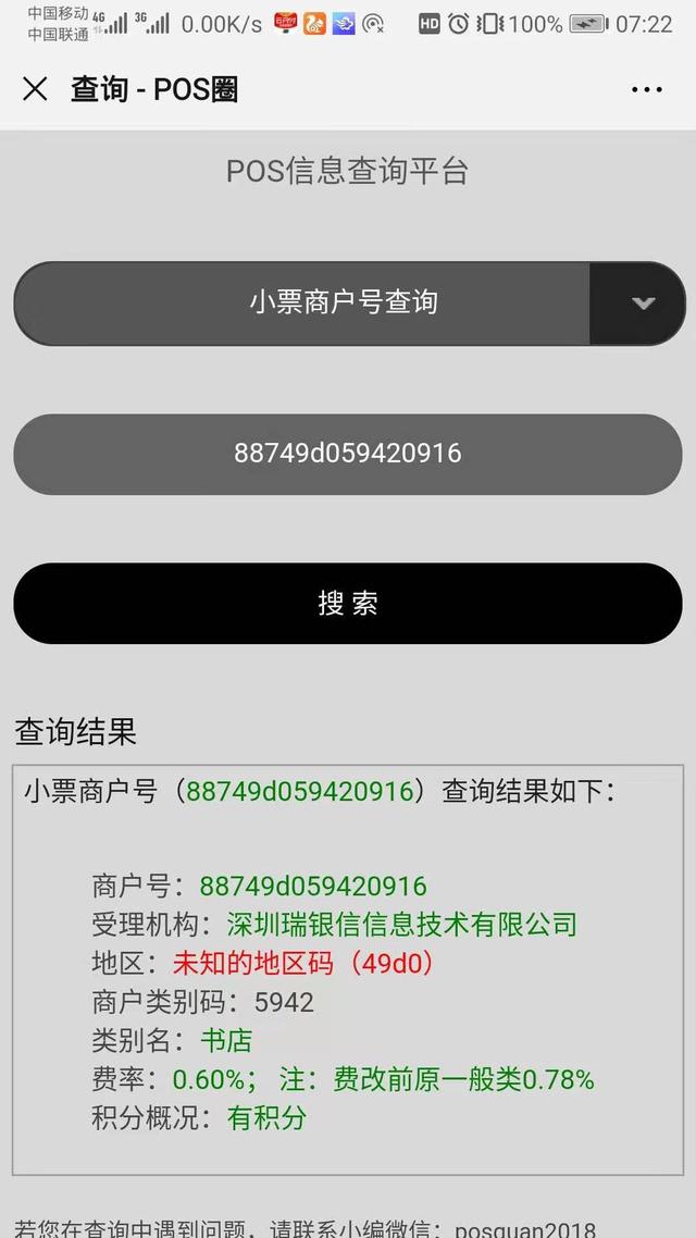 第三,微信關注POS支付網,在查詢系統里選擇小票商戶號查詢,輸入商戶號,一目了然,虛假商戶會顯示紅色的 [未知的地區碼(49D0)],如下圖。
